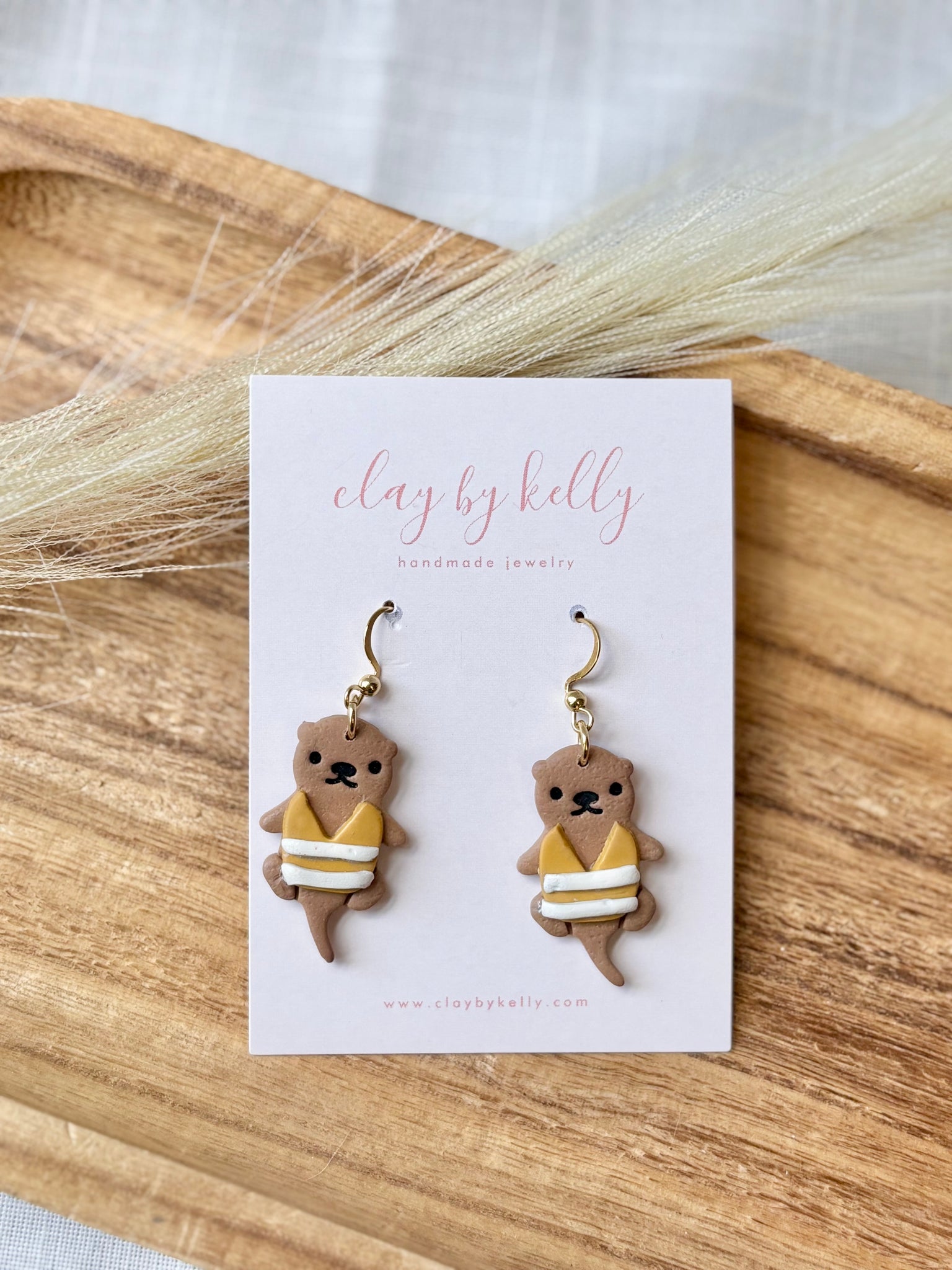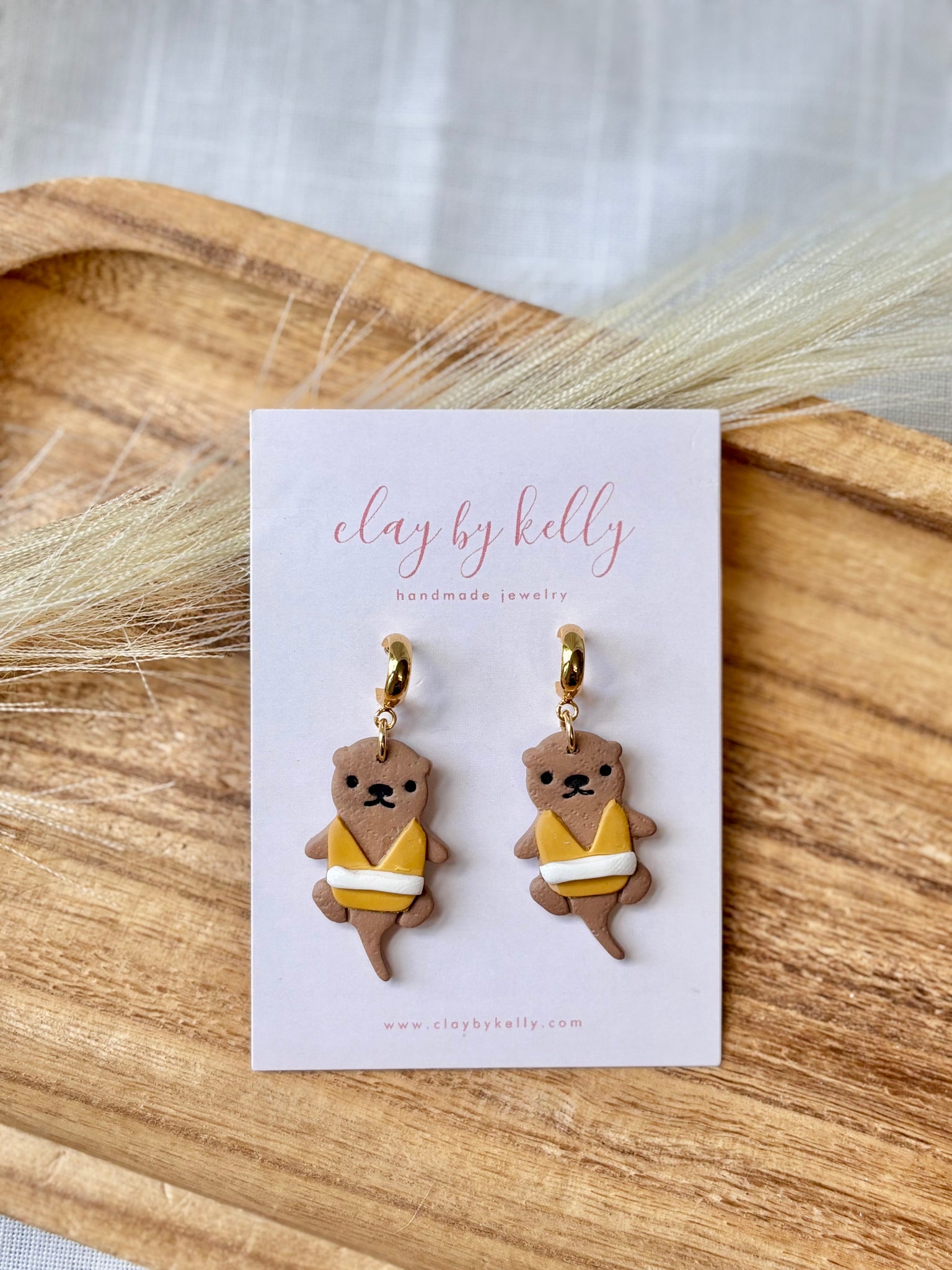 Add a splash of fun to your look with these playful polymer clay earrings featuring adorable otters wearing life vests. Lightweight and charming, they bring a touch of adventure to any outfit, perfect for animal lovers and those who enjoy unique accessories.