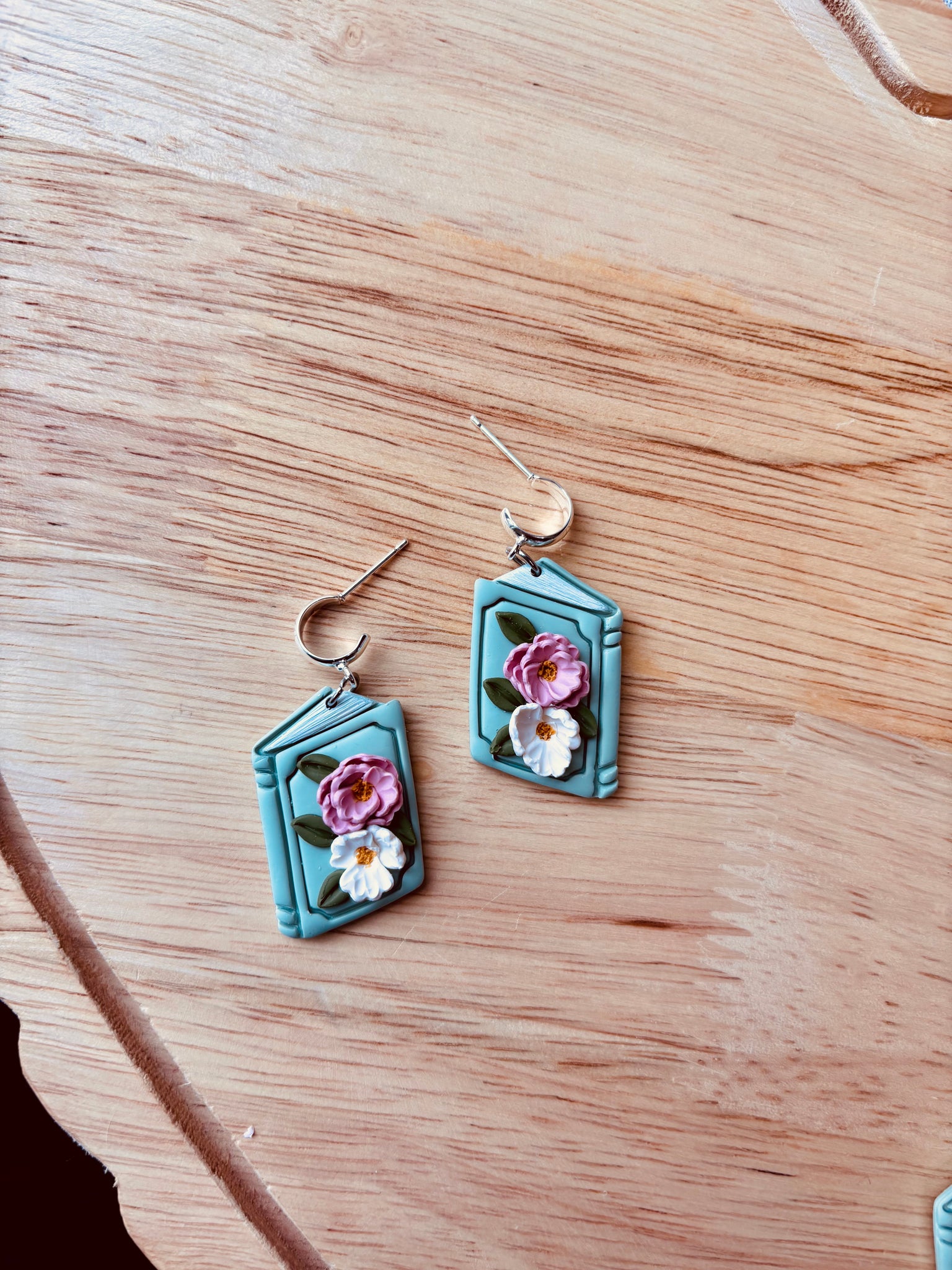 Curl up with literary charm! These delightful polymer clay earrings celebrate the joy of reading with sage green book designs and hand-painted edges. Each pair features whimsical pink, white, and green florals that bring garden-fresh beauty to your bookshelf aesthetic. Perfect for book lovers who wear their passion, these lightweight earrings come in two distinct styles to match your mood. Whether you're diving into your next great read or simply adore all things literary, these playful accessories are your new favorite accessory.