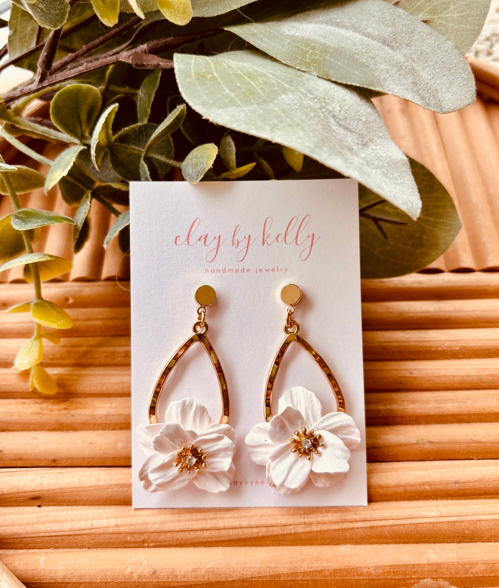 Delicate polymer clay flowers bloom from elegant gold-plated teardrop charms, each petal hand-crafted with meticulous detail. Choose from soft white, classic black, or blush pale pink blooms, all crowned with a golden pistil center that catches the light beautifully. These lightweight earrings bring a whimsical botanical touch to any look—perfect for flower lovers who appreciate artisan charm with a touch of glamour.