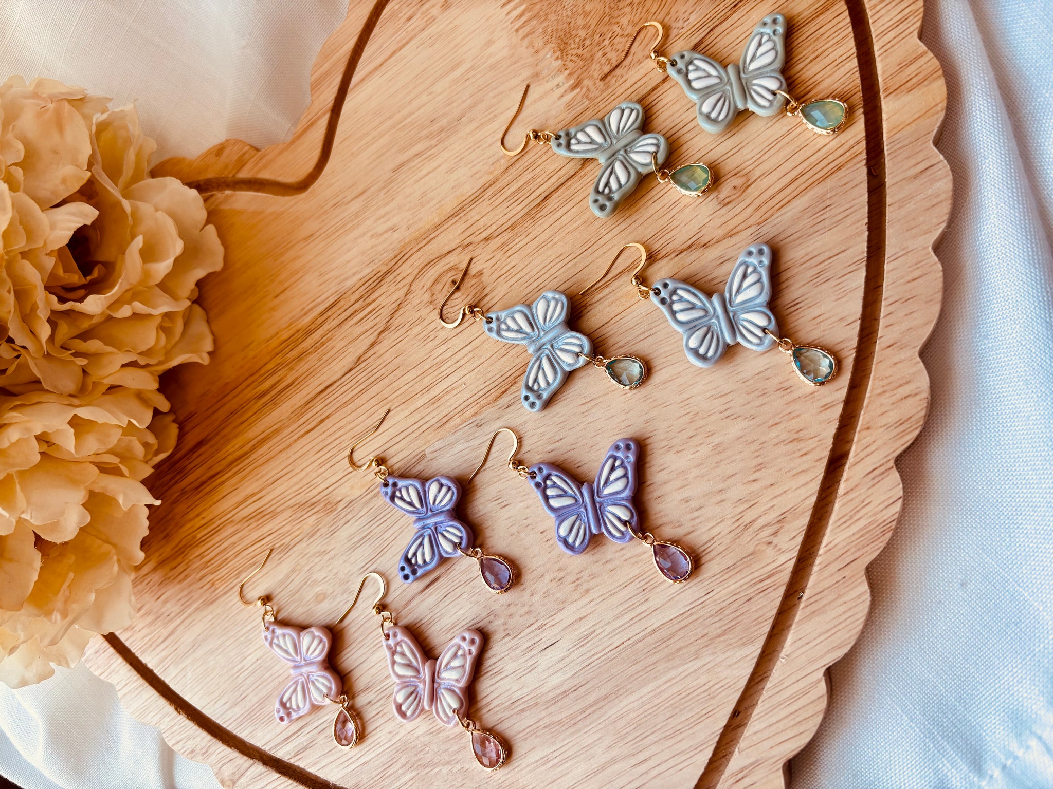 Delicate polymer clay butterflies catch the light with mesmerizing iridescent shimmer, creating an enchanting play of color with every movement. Each pair features a charming colored accent that adds personality and whimsy to your look. Perfect for butterfly lovers who want to wear a touch of magic and wonder. Lightweight and comfortable for all-day wear, these playful earrings bring joy and sparkle to any outfit